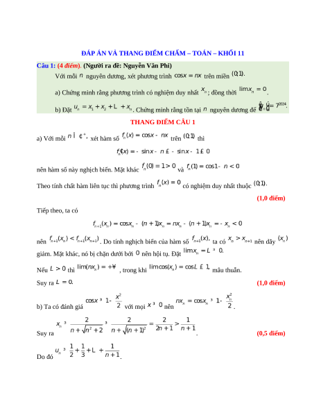 . Chứng minh rằng tồn tại nguyên dương để THANG ĐIỂM CÂU 1 a) Với mỗi xét hàm số trên thì
