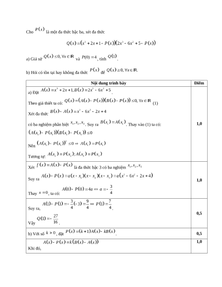 b) Hỏi có tồn tại hay không đa thức để Nội dung trình bày Điểm a) Đặt . Theo giả thiết ta có: (1) Xét đa thức có ba nghiệm phân biệt . Suy ra . Thay vào (1) ta có: 1,0 Nên Tương tự: Xét