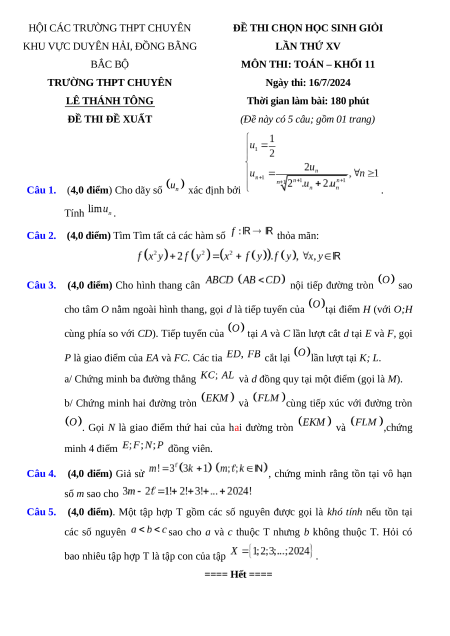 MÔN THI: TOÁN – KHỐI 11 TRƯỜNG THPT CHUYÊN Ngày thi: 16/7/2024 LÊ THÁNH TÔNG