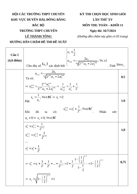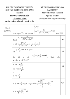 HƯỚNG DẪN CHẤM ĐỀ THI ĐỀ XUẤT Câu 1 (4,0 điểm) Cho dãy số xác định bởi . Tính . Ta có: 0.5 Đặt 1.0 Khi đó ta có: . Nhận xét: 1,0 0,75 0.75 + Lại có Mà nên theo nguyên lí kẹp: . Vậy . Câu 2
