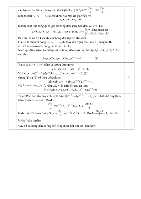 Câu 5 (4,0 điểm). Tại mỗi đỉnh của một đa giác đều n cạnh (n>2) người ta đặt một bóng đèn. Ban