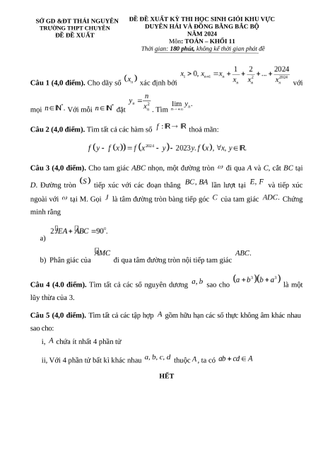 Đề thi HSG Toán 11 Trường THPT Chuyên Thái Nguyên
