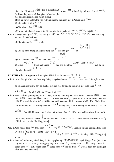PHẦN I. Câu trắc nghiệm nhiều phương án lựa chọn. Thí sinh trả lời từ câu 1 đến câu 12. Mỗi câu thí