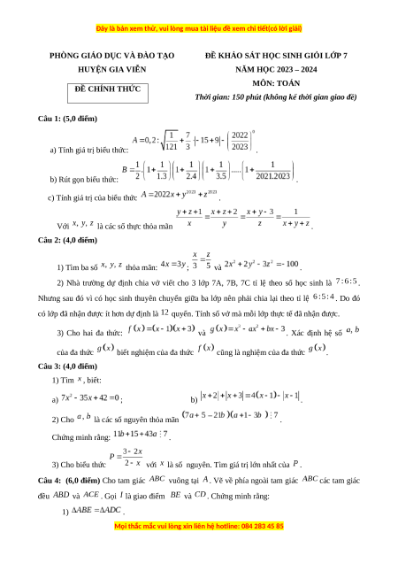 Đề thi HSG Toán 7 năm 2024 Phòng GD&ĐT Gia Viễn - Ninh Bình