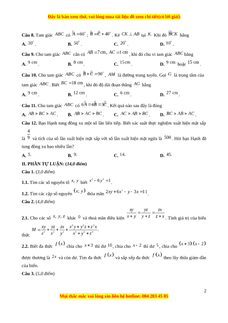 Câu 8. Tam giác có ; . Kẻ tại Khi đó bằng A. . B. . C. . D. . Câu 9. Cho tam giác cân có , khi đó chu vi tam giác bằng A. . B. . C. . D. hoặc . Câu 10. Cho tam giác có ,
