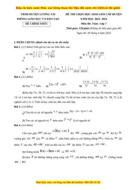 Đề thi HSG Toán 7 năm 2024 Phòng GD&ĐT Lương Tài - Bắc Ninh