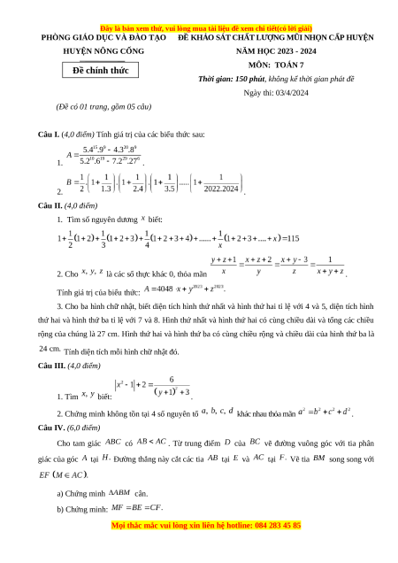 ĐỀ KHẢO SÁT CHẤT LƯỢNG MŨI NHỌN CẤP HUYỆN HUYỆN NÔNG CỐNG NĂM HỌC 2023 - 2024 MÔN: TOÁN 7 Đề chính thức