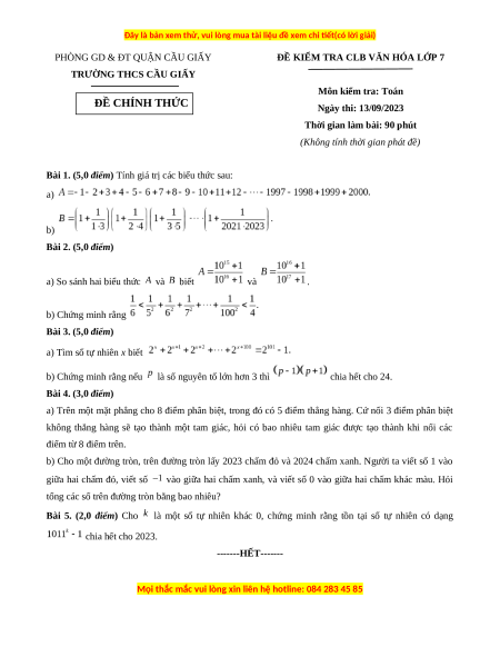 TRƯỜNG THCS CẦU GIẤY Môn kiểm tra: Toán ĐỀ CHÍNH THỨC Ngày thi: 13/09/2023