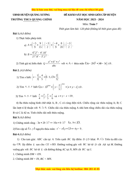 Đề thi HSG Toán 7 năm 2024 trường THCS Quảng Chính - Quảng Xương - Thanh Hóa