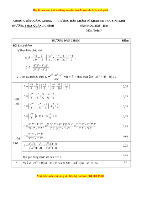 TRƯỜNG THCS QUẢNG CHÍNH NĂM HỌC 2023 - 2024 Môn: Toán 7 HƯỚNG DẪN CHẤM Điểm