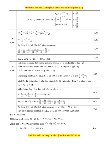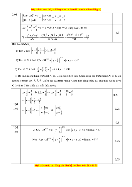C là 42 m. Tính chiều dài mỗi thửa ruộng. 0,25 1(a) 1,0đ 0,25 0,5 1(b) Vì với mọi 1,0đ Nên : với mọi 0,25 0,75