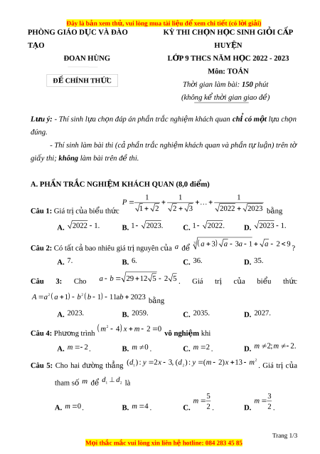 ệ đ xe ể m chi ti t ế (có l i ờ gi i ả ) PHÒNG GIÁO D C Ụ VÀ ĐÀO KỲ THI CH N Ọ H C Ọ SINH GIỎI C P Ấ TẠO HUYỆN ĐOAN HÙNG L P Ớ 9 THCS NĂM H C Ọ 2022 - 2023 Môn: TOÁN Đ Ề CHÍNH TH C Ứ Th i