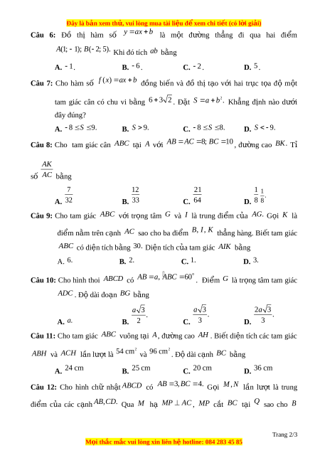 Câu 7: Cho hàm số f (x) ax b đồng bi n ế và đồ thị t o ạ v i ớ hai tr c ụ t a ọ độ m t ộ tam giác cân có chu vi b ng ằ 6 3 2 . Đ t ặ 2