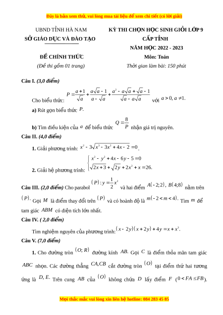 ệ đ xe ể m chi ti t ế (có l i ờ gi i ả ) UBND T N Ỉ H HÀ NAM KỲ THI CH N Ọ H C Ọ SINH GIỎI L P Ớ 9 S G Ở IÁO D C Ụ VÀ ĐÀO T O Ạ CẤP T N Ỉ H NĂM H C Ọ 2022 - 2023 ĐỀ CHÍNH TH C Ứ Môn: Toán (Đ t ề hi gồm 01 trang) Th i