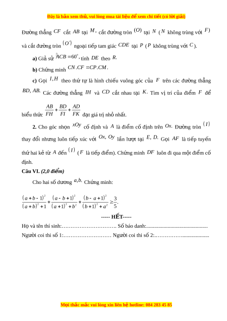 Câu VI. (2,0 đi m ể ) Cho hai sô dư ng ơ a, . b Ch ng m ứ inh: