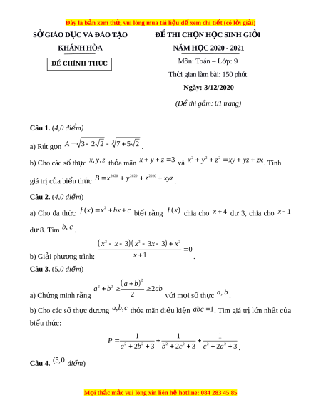 ệ đ xe ể m chi ti t ế (có l i ờ gi i ả ) S Ở GIÁO D C Ụ VÀ ĐÀO T O Ạ Đ Ề THI CH N Ọ H C Ọ SINH GI I Ỏ KHÁNH HÒA NĂM H C Ọ 2020 - 2021 Môn: Toán – L p: ớ 9 ĐỀ CHÍNH THỨC Th i ờ gian làm bài: 150 phút Ngày: 3/12/2020 (Đ ề thi g m ồ : 01 trang)