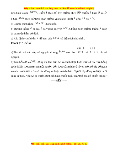 Câu 5. (3,5 đi m ể ) 2 a b 1 a 1 a) Tìm t t ấ cả các c p ặ số nguyên dư ng