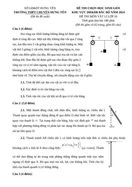 Đề thi HSG Vật Lí 10 Trường THPT Chuyên Hưng Yên