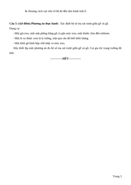 Câu 5: (4,0 điểm) Phương án thực hành: Xác định hệ số ma sát trượt giữa gỗ và gỗ. Dụng cụ: