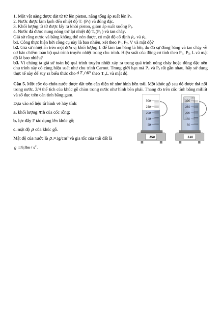 Câu 5. Một cốc đo chứa nước được đặt trên cân điện tử như hình bên trái. Một khúc gỗ sau đó được thả nổi