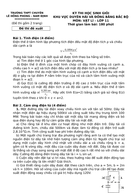 Đề thi HSG Vật Lí 11 Trường THPT Chuyên Lê Hồng Phong - Nam Định
