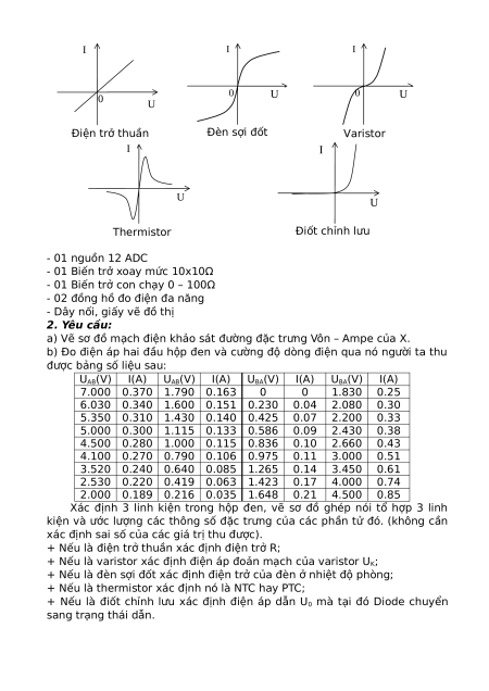 Cho biết dạng đặc trưng V – A của các linh kiện như sau: I I I 0 0 0 U U U Điện trở thuần Đèn sợi đốt Varistor I I U U Thermistor Điốt chỉnh lưu - 01 nguồn 12 ADC