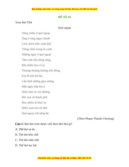 ĐỀ SỐ 16 Xem Bài Thơ Quê ngoại