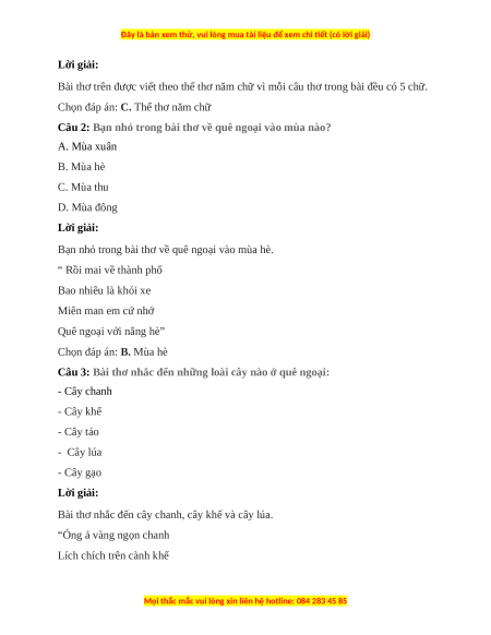 Câu 2: Bạn nhỏ trong bài thơ về quê ngoại vào mùa nào? A. Mùa xuân B. Mùa hè C. Mùa thu D. Mùa đông Lời giải: