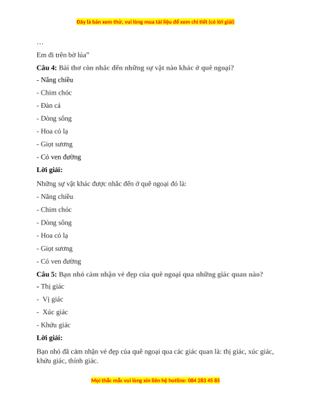 Câu 4: Bài thơ còn nhắc đến những sự vật nào khác ở quê ngoại? - Nắng chiều - Chim chóc - Đàn cá - Dòng sông - Hoa cỏ lạ - Giọt sương - Cỏ ven đường Lời giải: