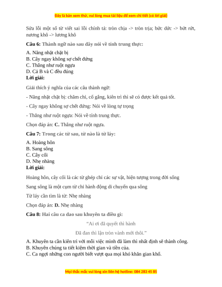 Câu 6: Thành ngữ nào sau đây nói về tính trung thực: A. Năng nhặt chặt bị