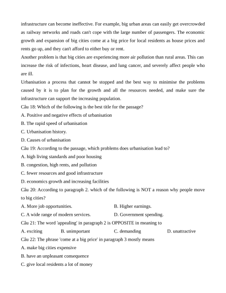 Câu 22: The phrase 'come at a big price' in paragraph 3 mostly means A. make big cities expensive