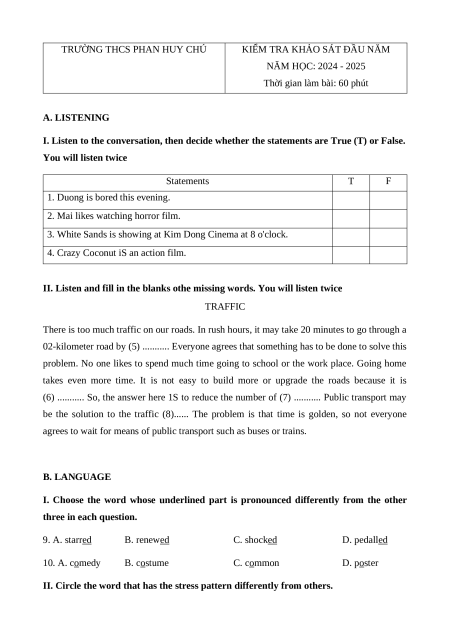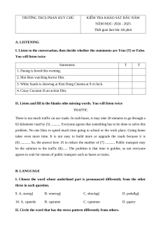 Đề thi KSCL Tiếng Anh 8 trường THCS Phan Huy Chú 2024-2025