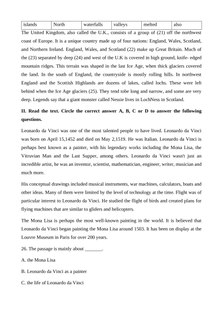 I. Fill in the numbered blanks in the passage with ONE suitable word from the box. islands North waterfalls valleys melted also