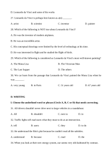 30. We car learn from the passage that Leonardo da Vinci painted the Mona Lisa when he was _______. A. very young B. in Paris C. 51 years old D. 67 years old D. WRITING