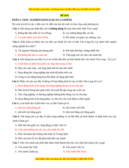 Câu 7. Nền văn minh nào dưới đây được hình thành trên lưu vực châu thổ sông Cửu Long? A. Văn minh Đại Việt. B. Văn minh Việt cổ. C. Văn minh Chăm-pa. D. Văn minh Phù Nam.