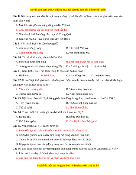 Câu 9. Văn minh Đại Việt còn được gọi là A. văn minh sông Hồng. B. văn minh Việt cổ. C. văn minh Thăng Long. D. văn minh sông Mã.
