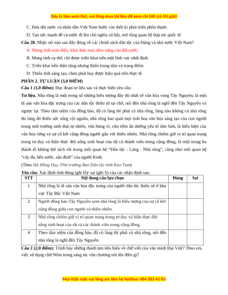 Câu 1 (1,0 điểm): Đọc đoạn tư liệu sau và thực hiện yêu cầu: