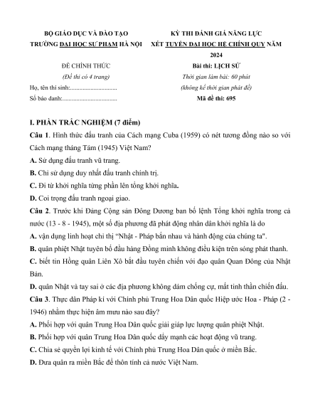 Đề thi Lịch sử ĐGNL Đại học Sư phạm Hà Nội năm 2024