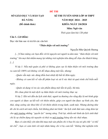 Đề thi Ngữ văn vào 10 Đà Nẵng năm 2015-2024 (đề chính thức)