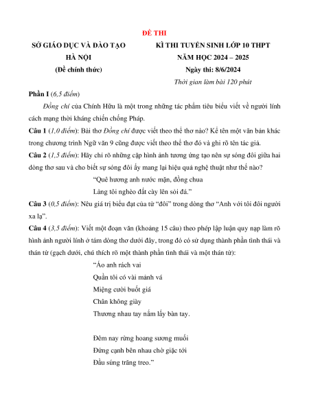 Đề thi Ngữ văn vào 10 Hà Nội năm 2015-2024 (đề chính thức)