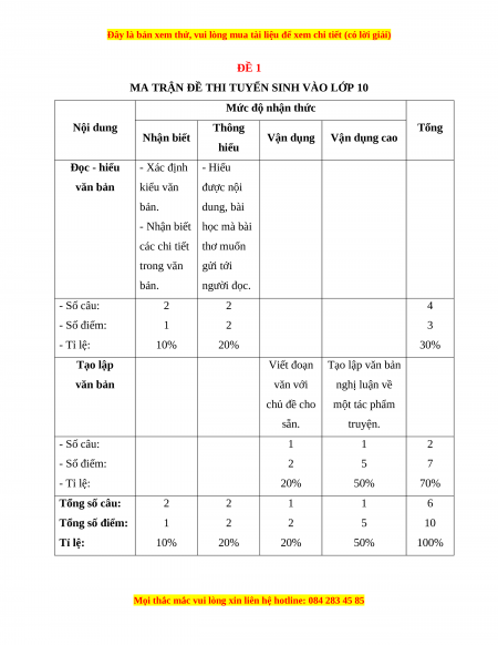 - Nhận biết học mà bài các chi tiết thơ muốn trong văn gửi tới bản. người đọc. - Số câu: 2 2 4 - Số điểm: 1 2 3 - Tỉ lệ: 10% 20% 30% Tạo lập Viết đoạn Tạo lập văn bản văn bản văn với nghị luận về chủ đề cho một tác phẩm sẵn. truyện. - Số câu: 1 1 2 - Số điểm: 2 5 7 - Tỉ lệ: 20% 50% 70% Tổng số câu: 2 2 1 1 6 Tổng số điểm: 1 2 2 5 10 Tỉ lệ: 10% 20% 20% 50% 100%