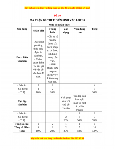 Mức độ nhận thức Nội dung Thông Vận Vận dụng Tổng Nhận biết hiểu dụng cao - Chỉ ra và nêu tác - Xác định dụng của phương biện pháp thức biểu tu từ được đạt của sử dụng văn bản. Đọc - hiểu trong câu - Chỉ ra văn bản văn. quan điểm - Giải của tác giả thích, đưa về vấn đề ra quan văn bản đề điểm về ý cập. kiến trong văn bản. - Số câu: 2 2 4 - Số điểm: 1 2 3 - Tỉ lệ: 10% 20% 30% Tạo lập văn Viết đoạn bản nghị Tạo lập văn với luận về một văn bản chủ đề tác phẩm cho sẵn. truyện. - Số câu: 1 1 2 - Số điểm: 2 5 7 - Tỉ lệ: 20% 50% 70% Tổng số câu: 2 2 1 1 6 Tổng số điểm: 1 2 2 5 10 Tỉ lệ: 10% 20% 20% 50% 100%