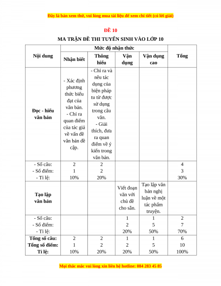 MA TRẬN ĐỀ THI TUYỂN SINH VÀO LỚP 10