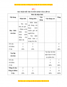 Mức độ nhận thức Nội dung Vận Tổng Nhận biết Thông hiểu Vận dụng cao dụng - Hiểu được - Tên văn nội dung, mà bản, tác giả. đoạn trích - Nhận ra lời Đọc - hiểu muốn gửi tới nhân vật, văn bản người đọc. hoàn cảnh - Xác định sống của được hàm ý nhân vật. trong câu văn. - Số câu: 2 2 4 - Số điểm: 2 2 4 - Tỉ lệ: 20% 20% 40% Tạo lập văn bản Tạo lập nghị luận về một văn bản tác phẩm thơ. - Số câu: 1 1 - Số điểm: 6 6 - Tỉ lệ: 60% 60% Tổng số câu: 2 2 1 5 Tổng số điểm: 2 2 6 10 Tỉ lệ: 20% 20% 60% 100%