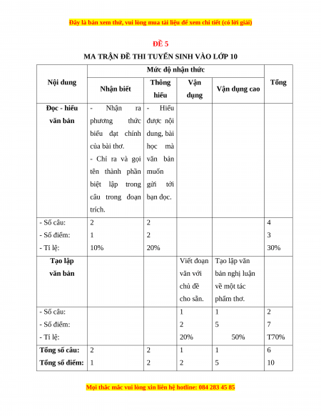Viết đoạn Tạo lập văn văn bản văn với bản nghị luận chủ đề về một tác cho sẵn. phẩm thơ. - Số câu: 1 1 2 - Số điểm: 2 5 7 - Tỉ lệ: 20% 50% T70% Tổng số câu: 2 2 1 1 6 Tổng số điểm: 1 2 2 5 10