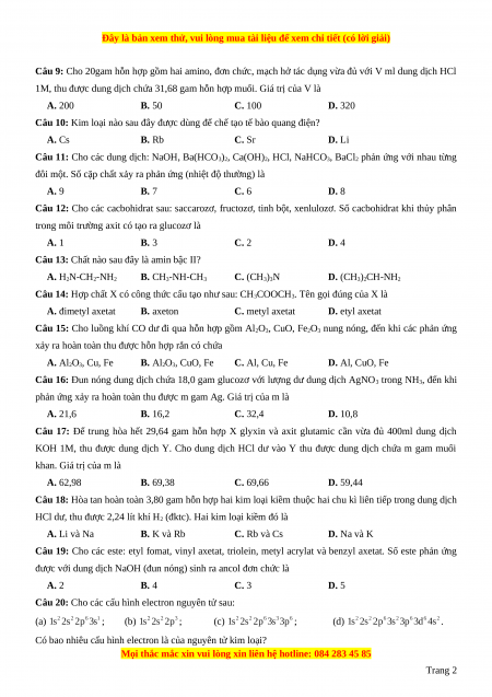 Câu 9: Cho 20gam hỗn hợp gồm hai amino, đơn chức, mạch hở tác dụng vừa đủ với V ml dung dịch HCl