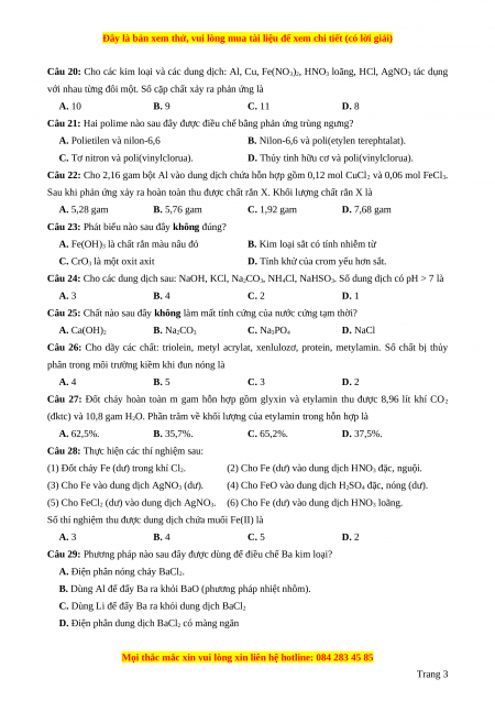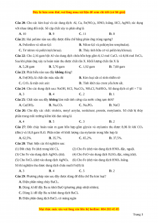Câu 25: Chất nào sau đây không làm mất tính cứng của nước cứng tạm thời? A. Ca(OH)2 B. Na2CO3 C. Na3PO4 D. NaCl