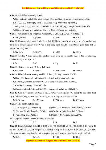 Câu 22: Cho dung dịch muối X vào dung dịch KOH dư, thu được dung dịch Y chứa ba chất tan.