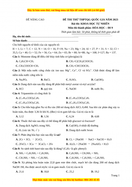 Môn thi thành phần: HÓA HỌC – Đề 9