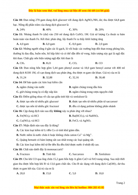 Câu 18: Chất nào dưới đây là monosaccarit? A. Fructozo B. Tinh bột C. Saccarozo D. Xenlulozo